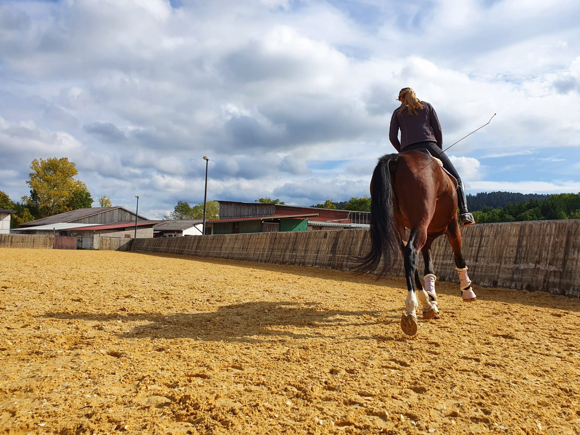 Auf unserem großen Reitplatz mit 50×25 Metern, Flutlicht und Bewässerung, können Sie bestens mit Ihrem Pferd Reiten oder am Boden arbeiten. Zudem bietet sich unser Roundpen mit 20 Meter ideal zum longieren oder Freiarbeiten an.